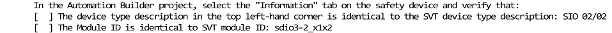 For 3rd party devices, verify that the version of the GSDML file shown in the SVT checklist is identical to the expected version from the safety device vendor.