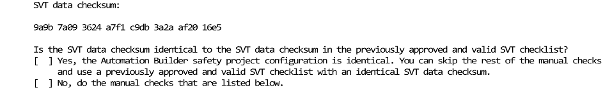 Use this data checksum to verify changes to the data for this safety device. If the data checksum is identical to a previously validated SVT checklist, the data for this safety device is identical and you can skip the manual checks for it. If the data checksums are not identical, repeat all of the manual checks for the safety device.